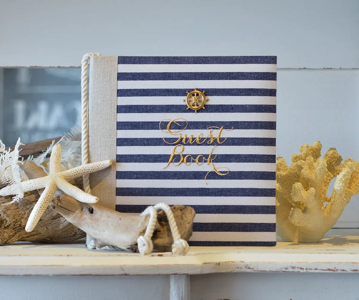 海辺の会場やリゾートウエディングの方におすすめのBlue Marine。ネイビーとホワイトのストライプ生地にNYより届いたおしゃれなマリンモチーフのチャームとゴールドの刺繍がポイント。中紙はイエローで明るい印象に仕上げています。