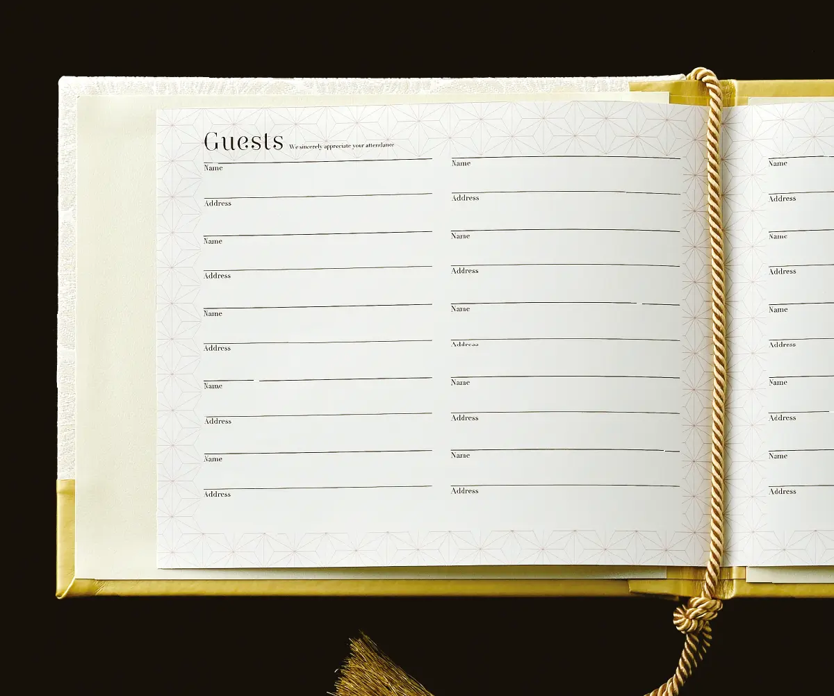 古典柄の白無垢着物生地を贅沢に使用したブック型の芳名帳。夫婦円満な姿を意味する菱形の中に鶴を向かい合わせた生地の柄に上品な光沢と落ち着いたゴールドレザーをあわせ、モダンで高級感のあるデザインに。中紙は麻の葉模様が施して和の優しい印象に仕上げています。