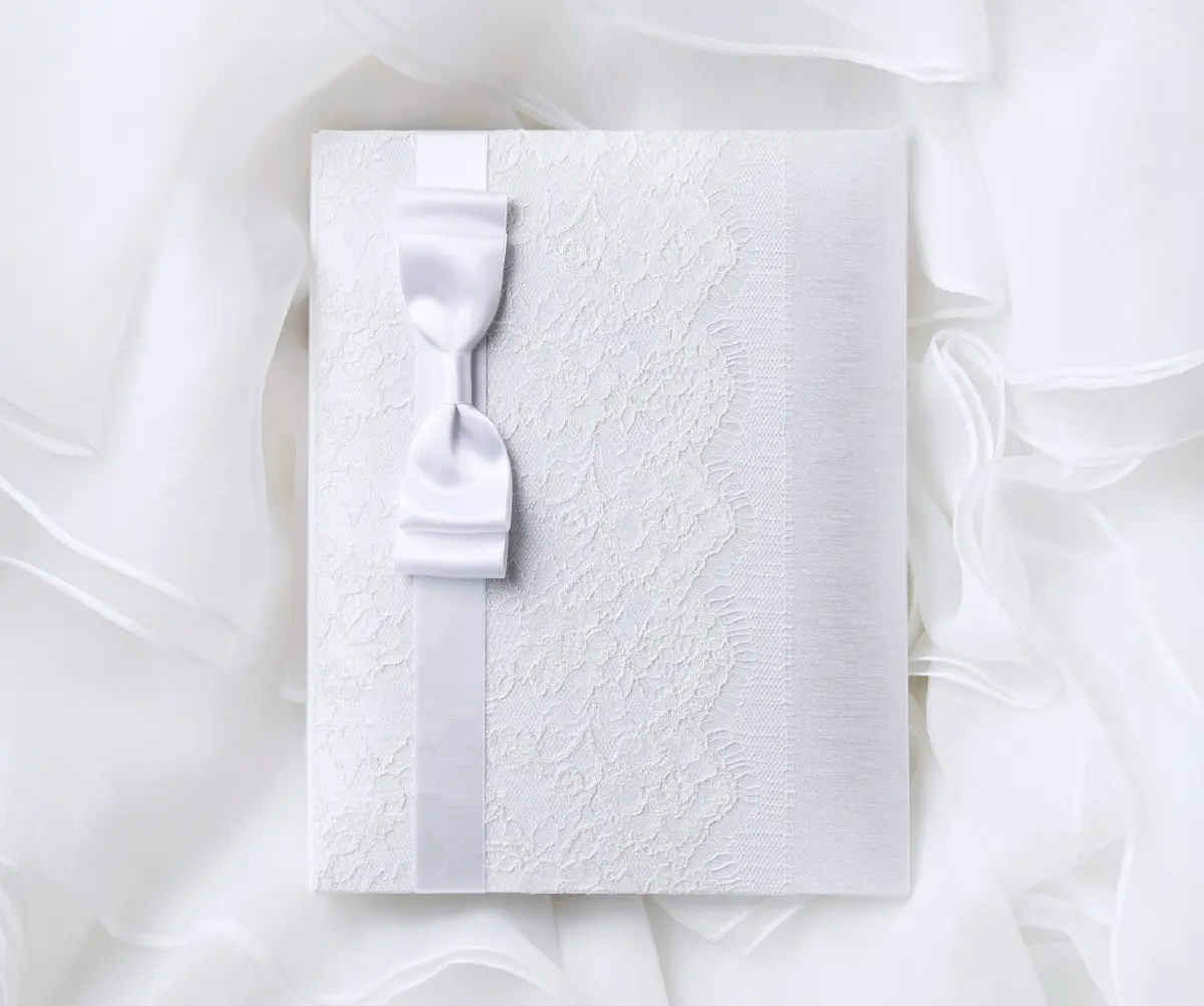 ウエディングドレスにも使用されているミカド生地とレースで包まれたWhite Magic。中を開くと、サムシングブルーをイメージさせる優しい色合いと表紙のレース地がプリントされた中紙で気品あふれるデザインとなっています。