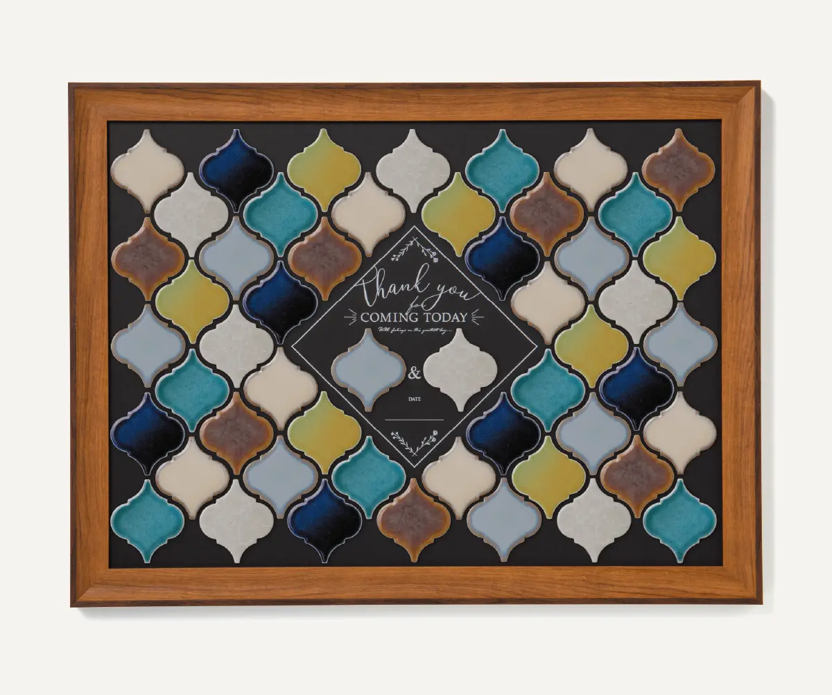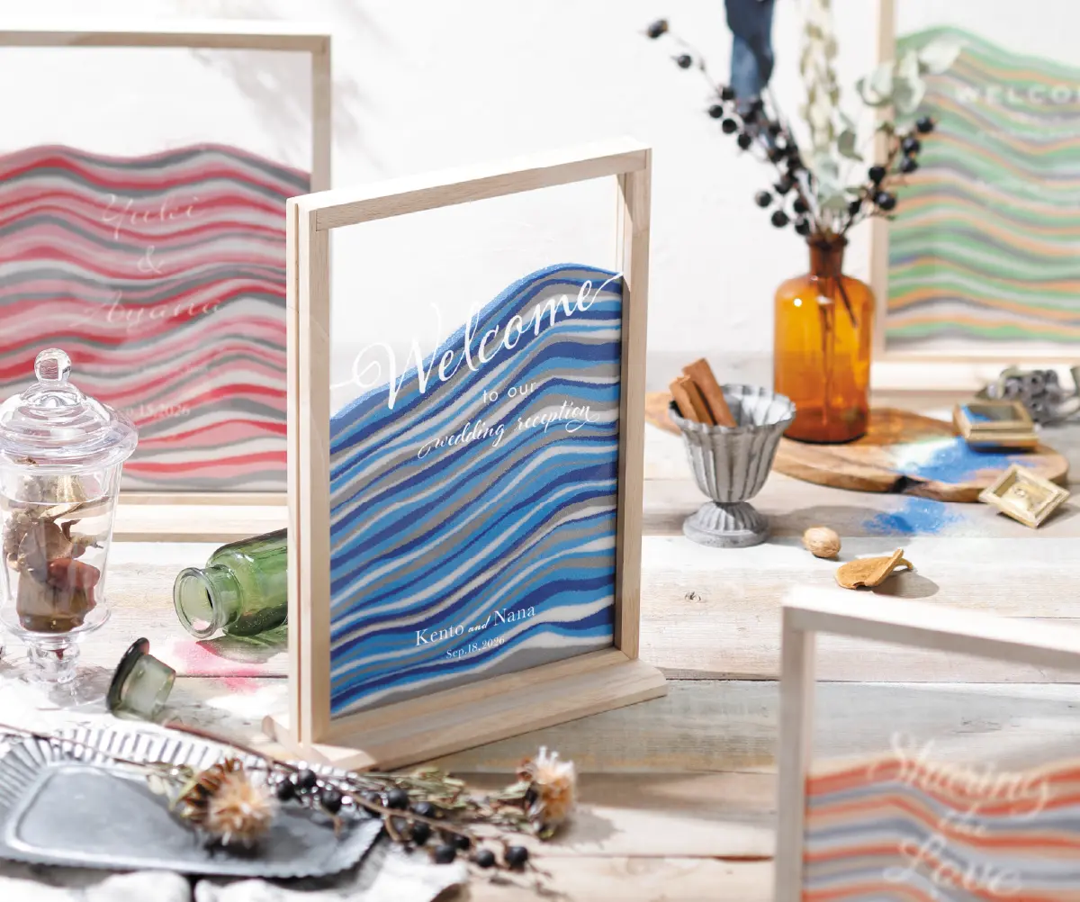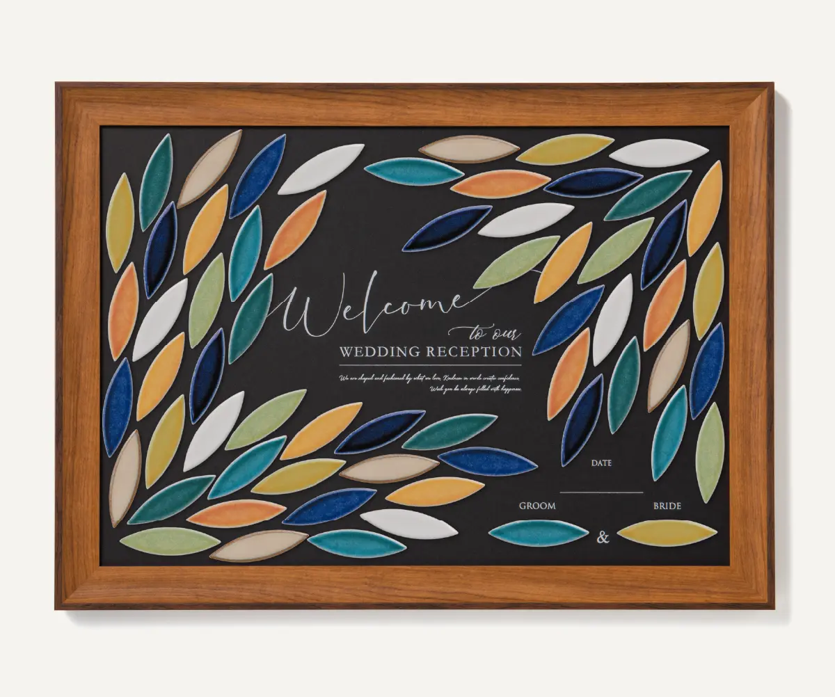 ひとつひとつの想い(タイル)を集めて完成させるオンリーワンアート。ゲストがおふたりの幸せを想いながらタイルに名前を書き、ひとつのボードにそれぞれお好きな場所に貼って作るオリジナルのボード。みんなで作るタイルの模様がアートになり、おふたりを見守り続けます。