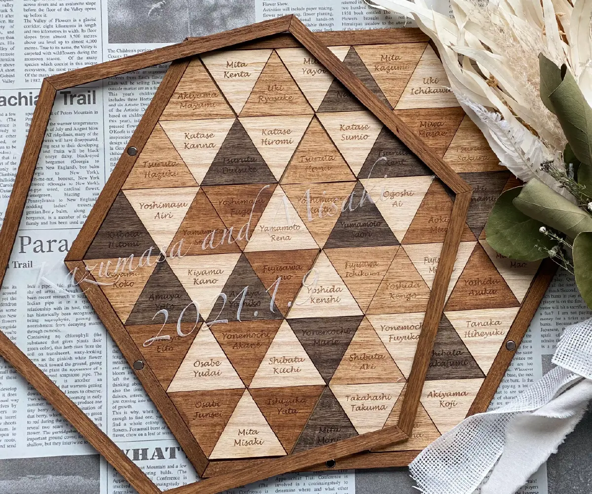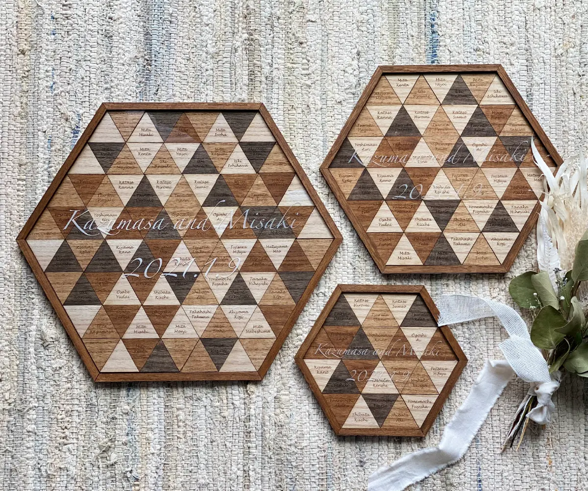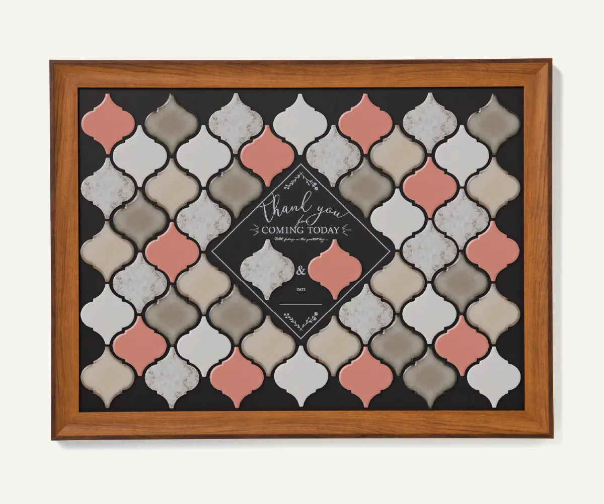 ひとつひとつの想い(タイル)を集めて完成させるオンリーワンアート。ゲストがおふたりの幸せを想いながらタイルに名前を書き、ひとつのボードにそれぞれお好きな場所に貼って作るオリジナルのボード。みんなで作るタイルの模様がアートになり、おふたりを見守り続けます。