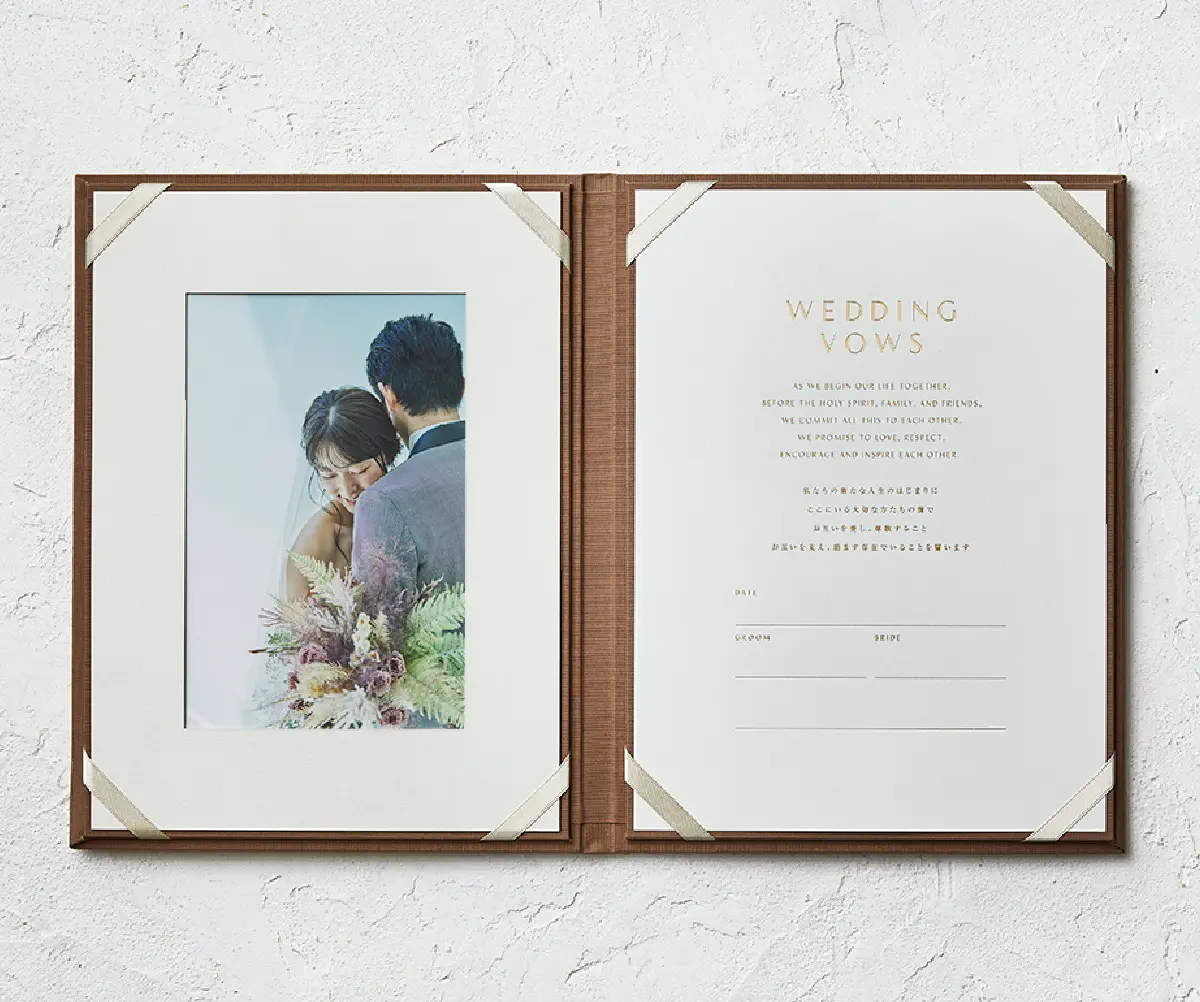 右側にはおふたりの署名や日付を書き込むことができ、左側にはおふたりの思い出のお写真(2Lサイズ)を入れることができます(人前式の場合は、ゲスト全員のサインが入ります)