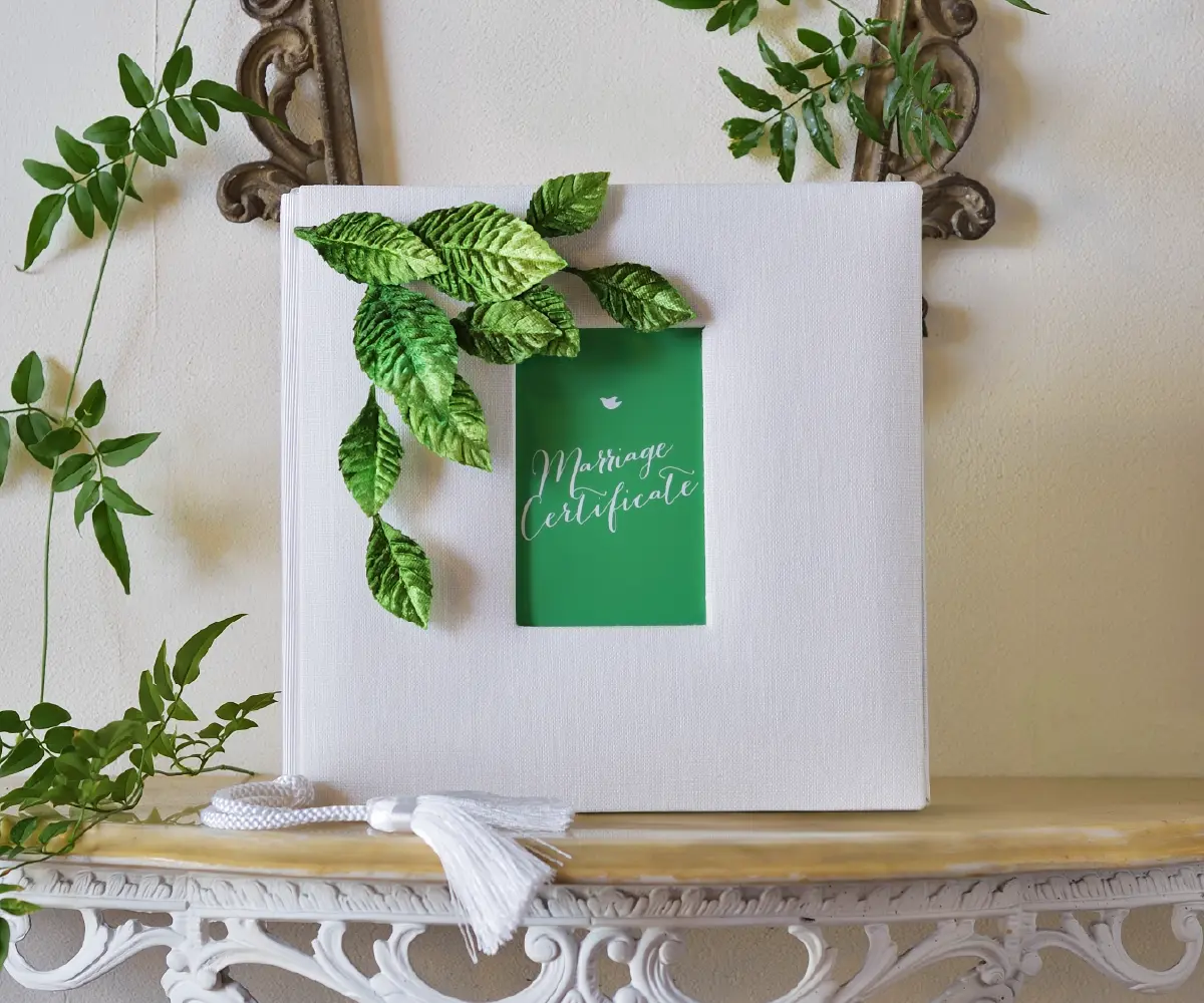 葉っぱのモチーフが印象的な爽やかなGreen Chicの結婚証明書。白×グリーンの布張りのブック型結婚証明書はナチュラルで爽やかなデザイン。白のタッセルで上質感をプラスした結婚証明書は新緑の季節やガーデンウエディングにもおすすめ。小窓付きの表紙にはお好みのお写真を入れることができます。