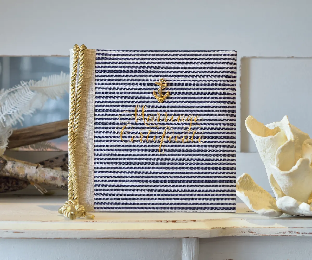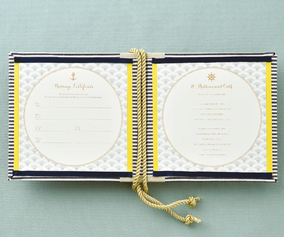 海辺やリゾートでのウエディングをお考えの方におすすめのBlue Marine。ストライプの布にNYより届いたマリンモチーフがチャームポイントのブック型結婚証明書。ゴールドの刺繍とタッセルで甘すぎない印象で中はビビットなイエローとマリン柄がアクセントに。夏の季節や海をモチーフにしたウエディングにぴったりです。