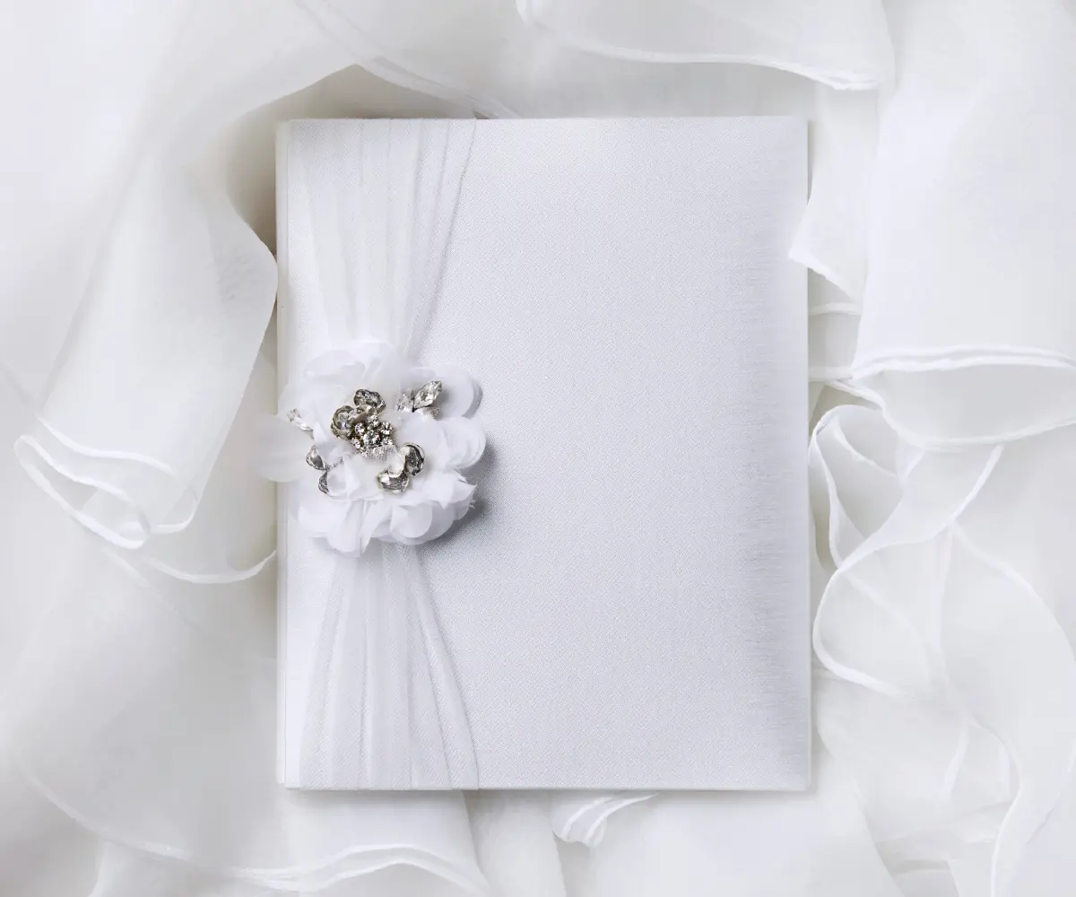 ウエディングドレスにも使用されているミカド生地とレースで包まれたWhite Magic。中を開くと、サムシングブルーをイメージさせる色合いと表紙のレース地がプリントされた中紙で気品あふれるデザインに仕上げています。
