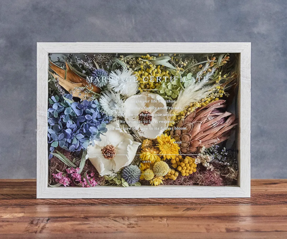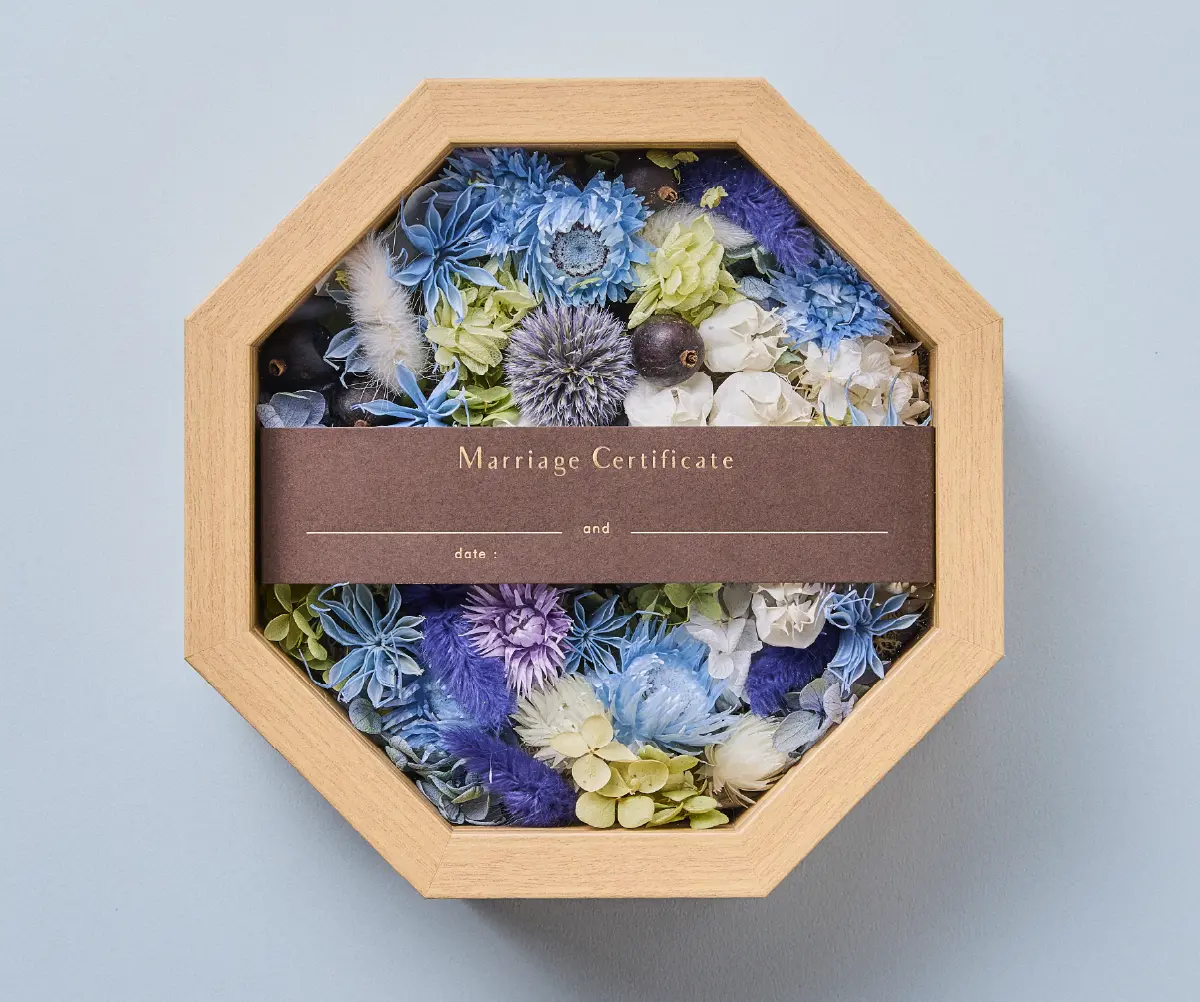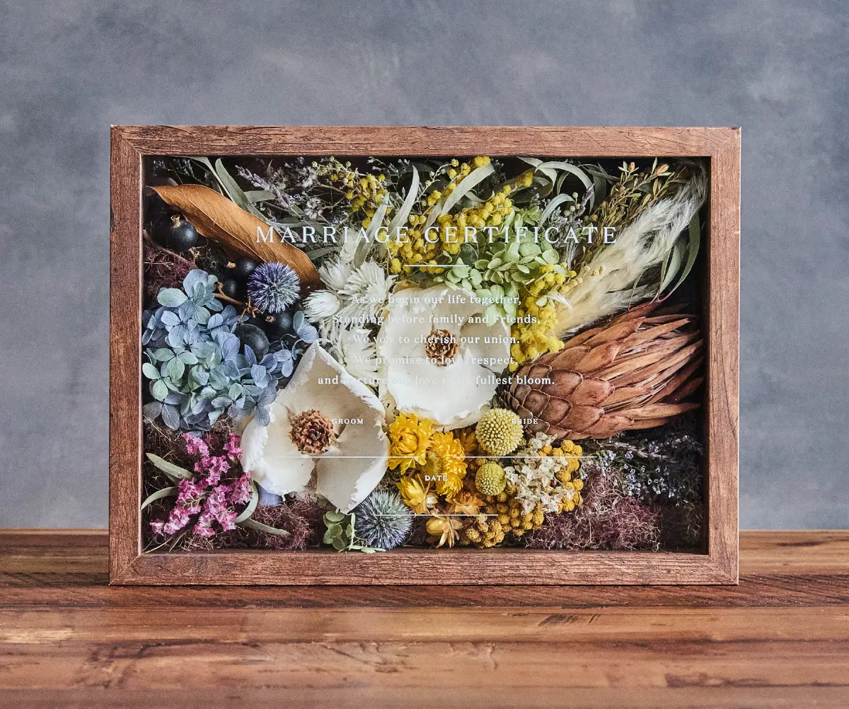ゲストの皆さまから結婚の承認としてお好きなプリザーブドとドライフラワーのお花を詰めてもらい 完成させる結婚証明書。 カラーは ブルー系、ピンク系、グリーン系、オレンジ系の4種類をご用意しました。 おふたりとゲストの皆さまで完成させる結婚証明書は 結婚式後もご自宅の玄関やリビングなどに飾ってお愉しみいただけます。