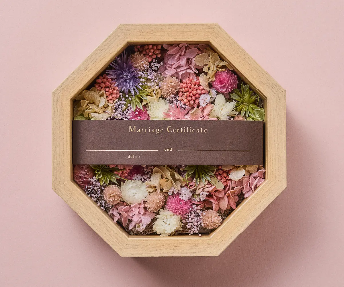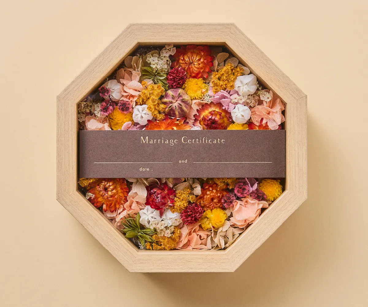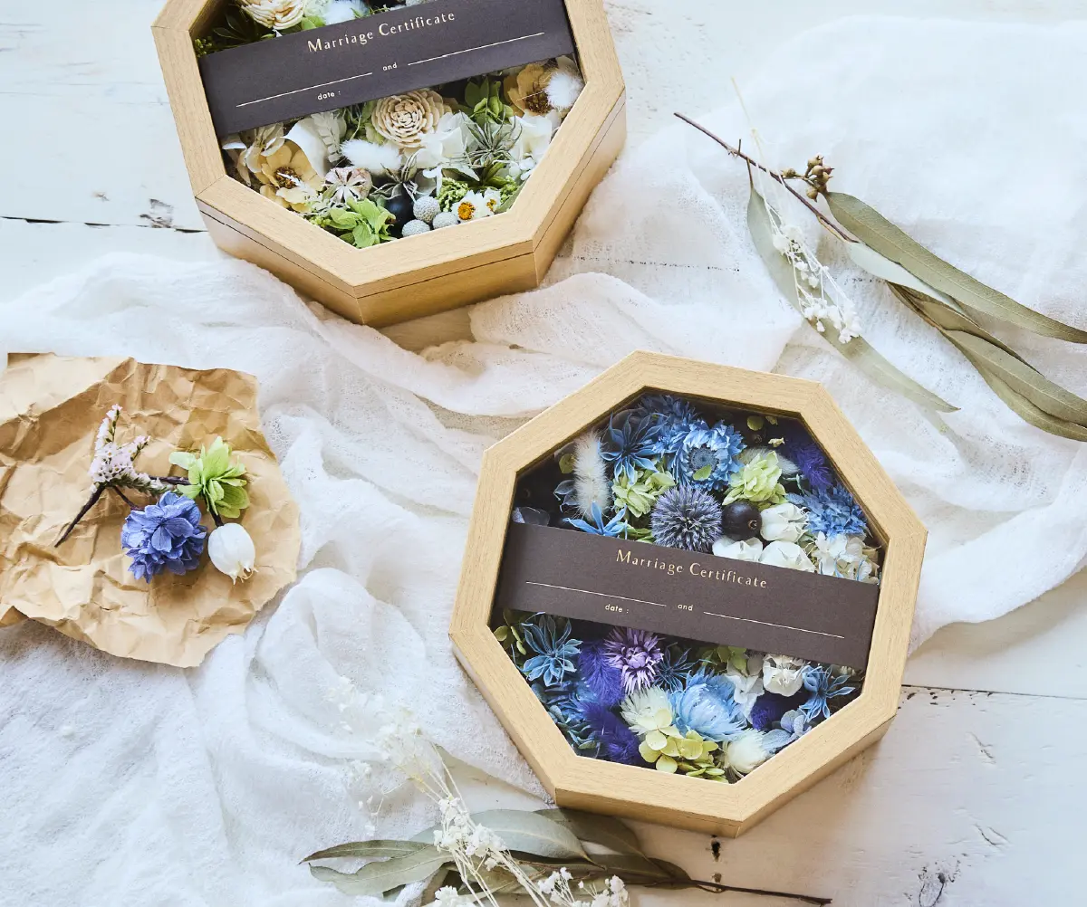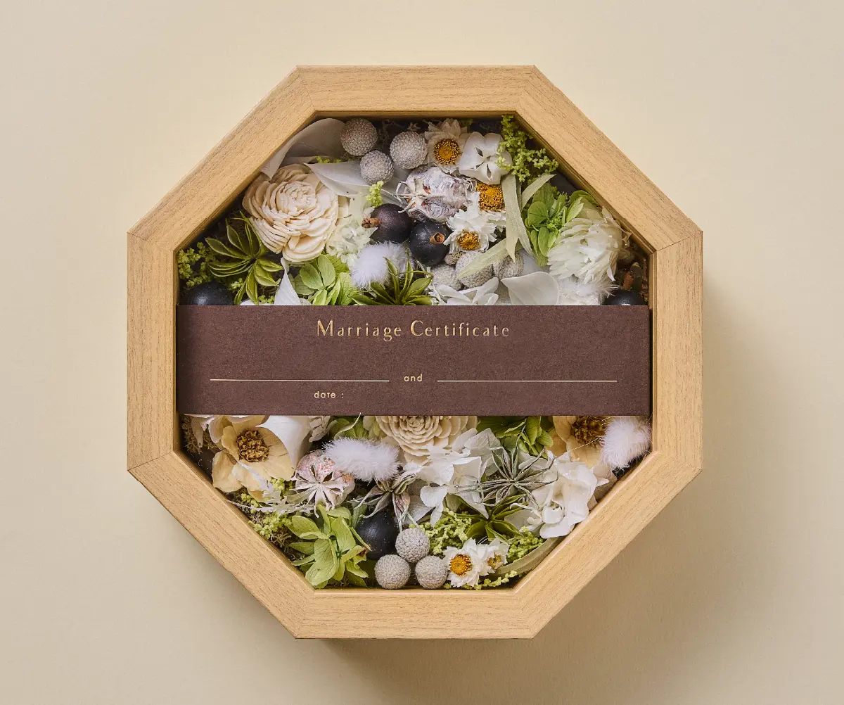 ゲストの皆さまから結婚の承認としてお好きなプリザーブドとドライフラワーのお花を詰めてもらい 完成させる結婚証明書。 カラーは ブルー系、ピンク系、グリーン系、オレンジ系の4種類をご用意しました。 おふたりとゲストの皆さまで完成させる結婚証明書は 結婚式後もご自宅の玄関やリビングなどに飾ってお愉しみいただけます。