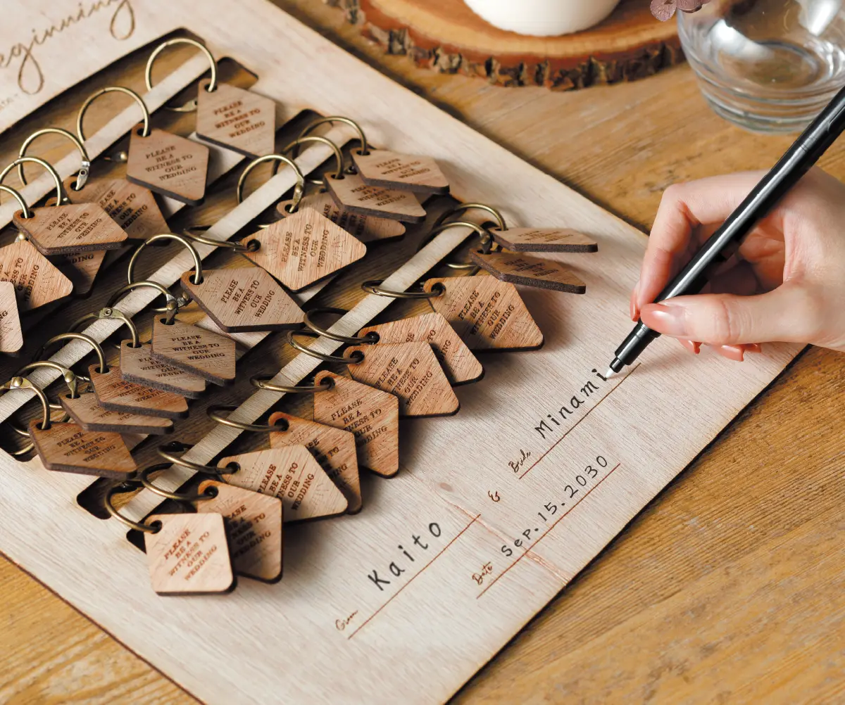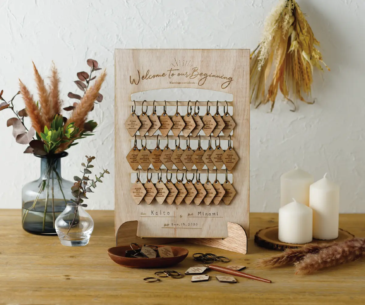 おふたりの門出に寄り添う木のぬくもりとゲストのあたたかな「心」を感じるゲスト参加型の結婚証明書。ウェルカムスペースでゲストに記入をしてもらい、チャームをつけておふたりの結婚を承認します。ウェルカムスペースに設置すれば、結婚式までの待ち時間にも期待感が高まる演出となります。