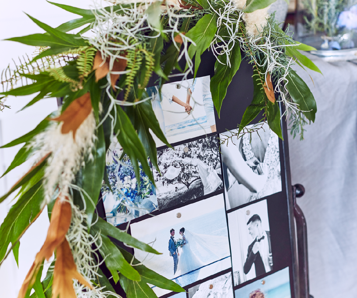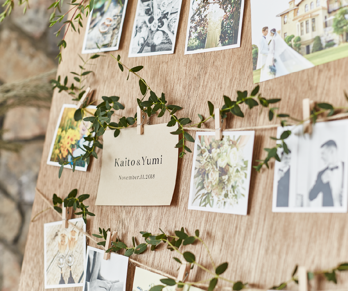フォトボードの上下や麻ひもにグリーンを巻き付け世界観を表現