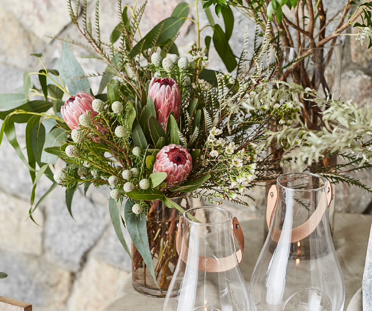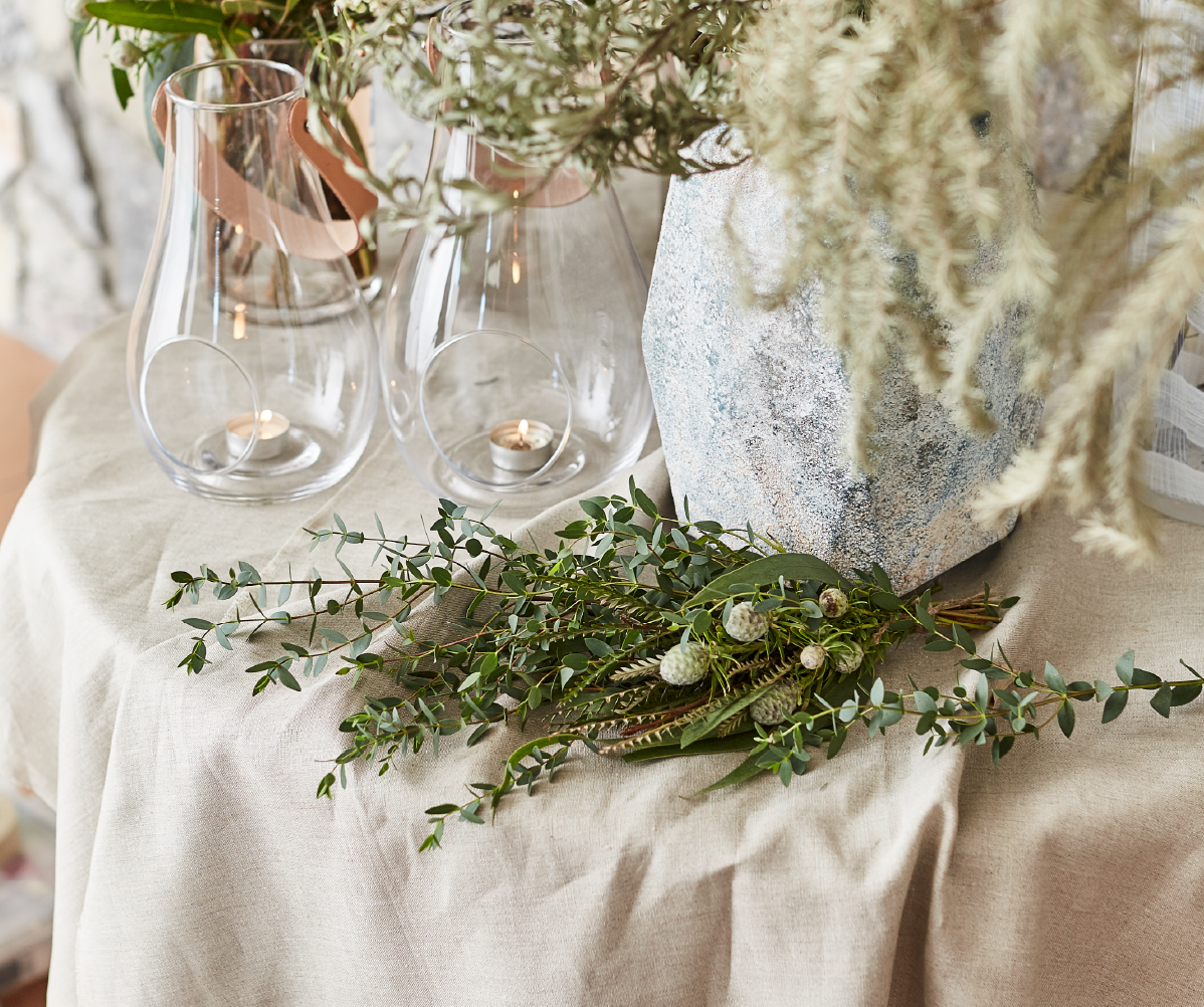 アットホームで飾らない雰囲気がお好きなおふたりにおすすめ。木とガラスの上質でシンプルなコーディネートに、エバーグリーンをふんだんに入れて、ナチュラルな中にも華やかさを加えて。