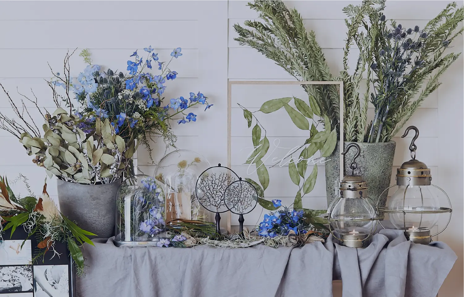 ブルーのブーケとランタンで大人のマリンスタイルを表現