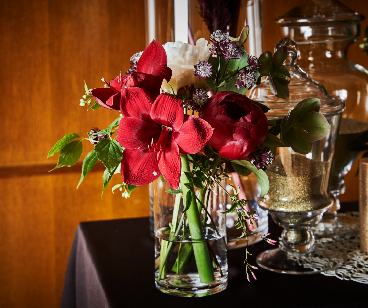 深い赤がアクセントのブーケで華やかさをプラス