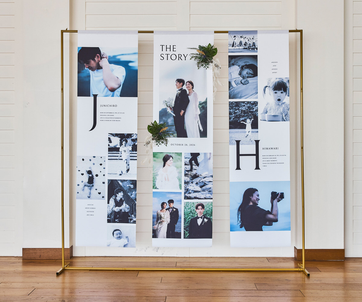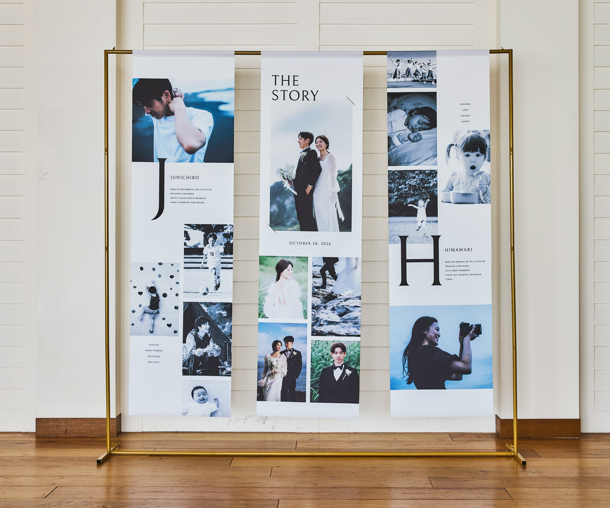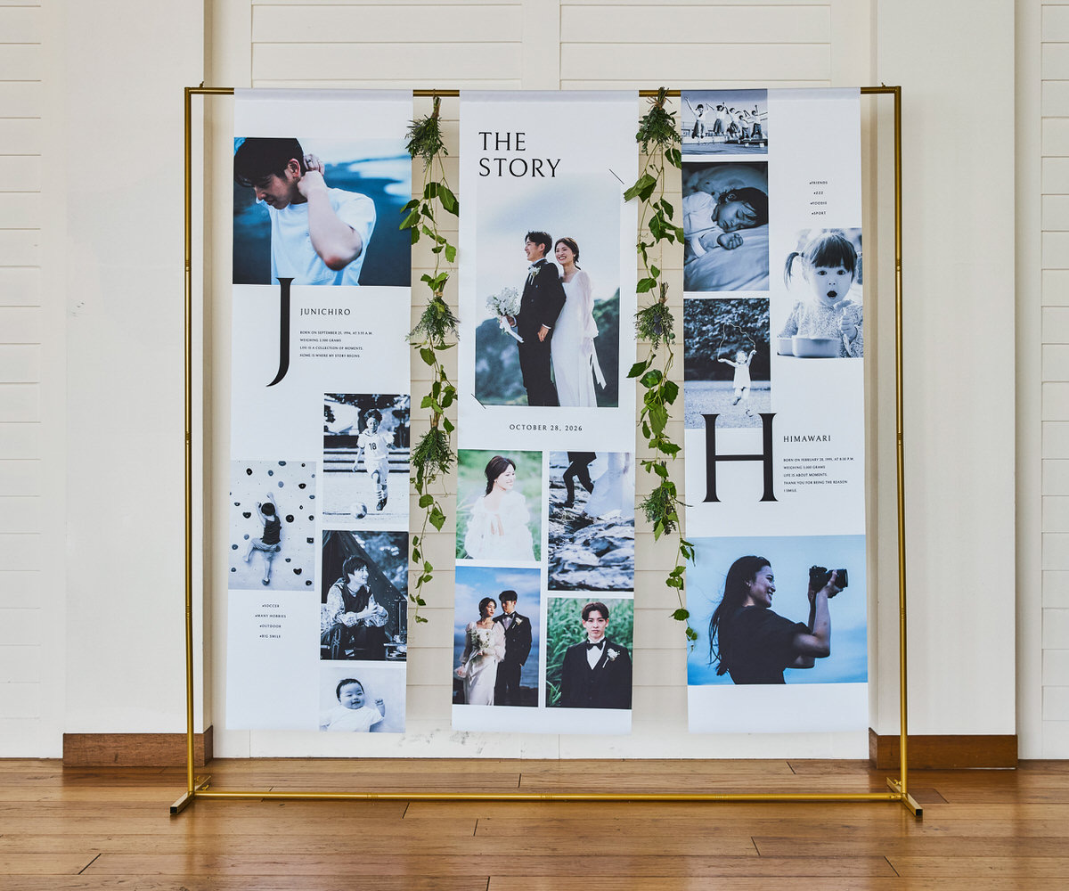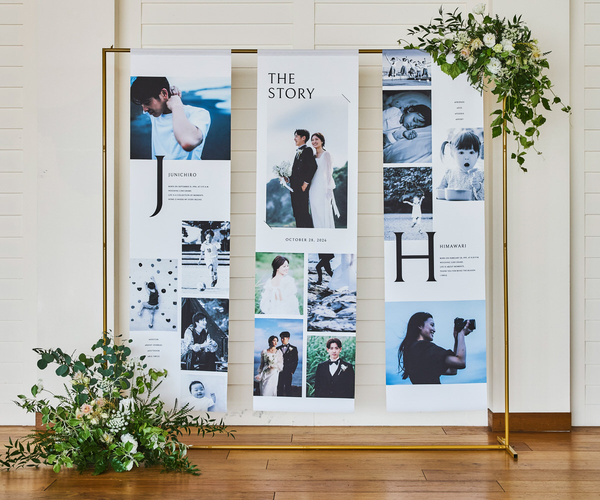 想い出をアートのように、たいせつな瞬間を並べたノバレーゼオリジナルのフォトタペストリー。両サイドの布にはおふたりそれぞれの幼少期からの物語を、中央にはおふたりが出会われてからのストーリーを描くことができます。タペストリーにお花をプラスして華やかに演出することや両サイドのおふたり幼少期はご親族へのプレゼントしてそれぞれご家庭で素敵に飾れることまで計算されたデザインになっています。