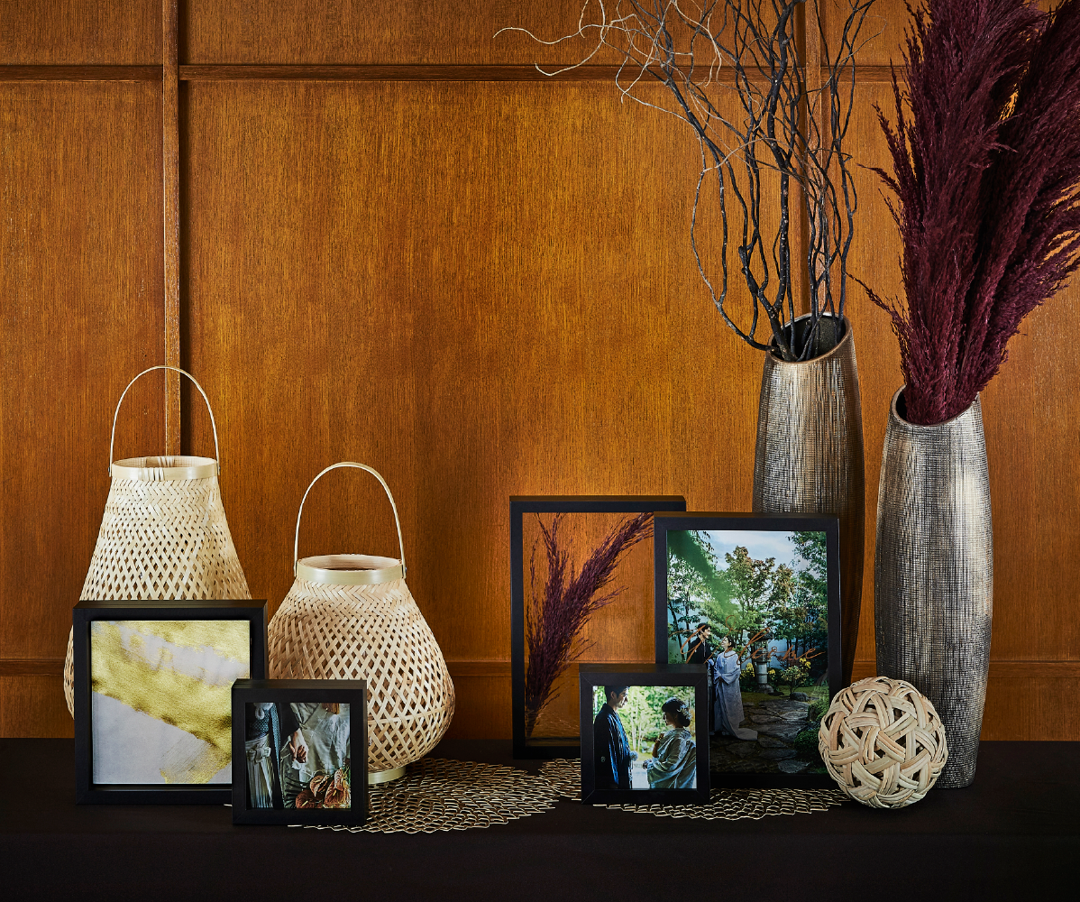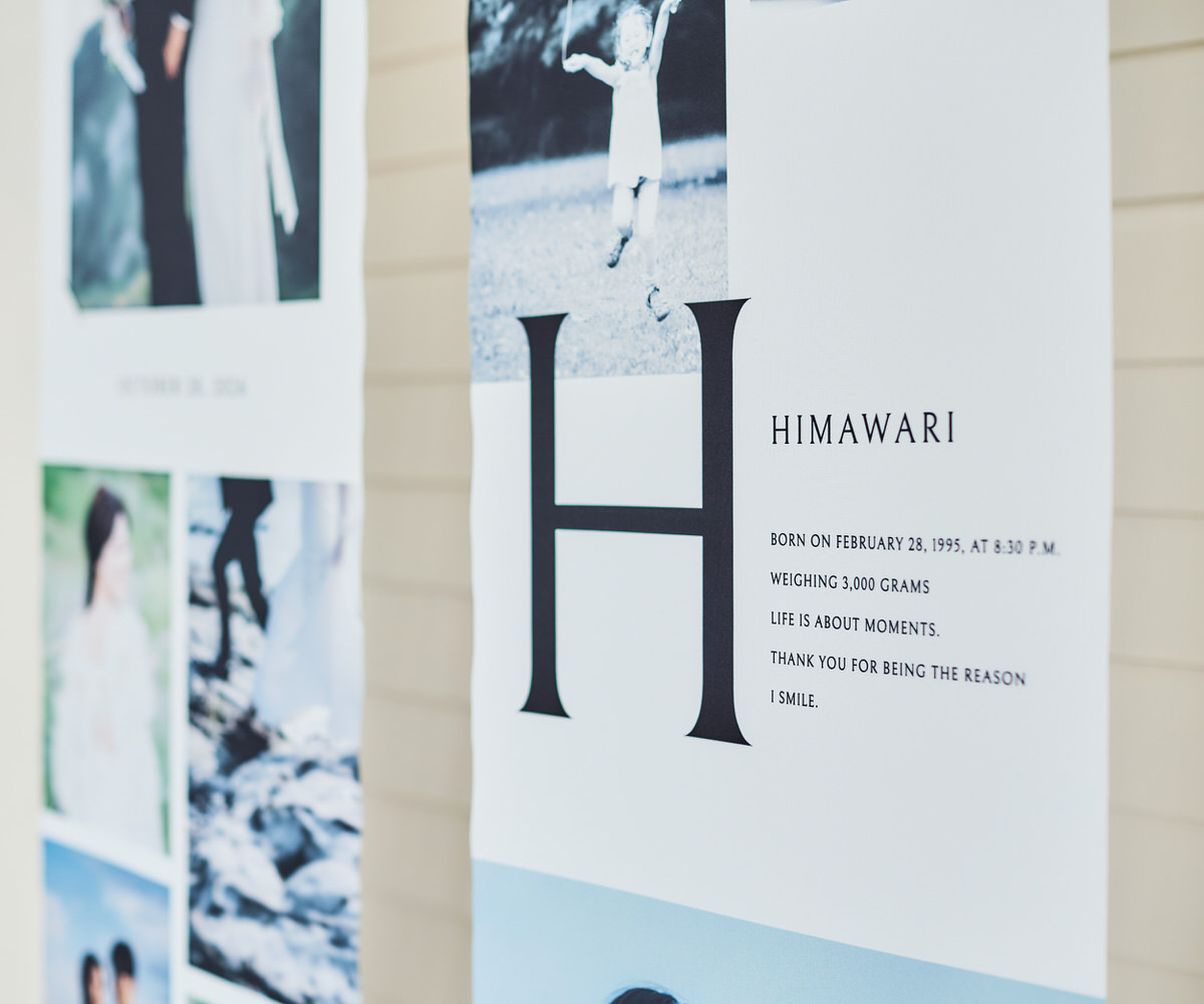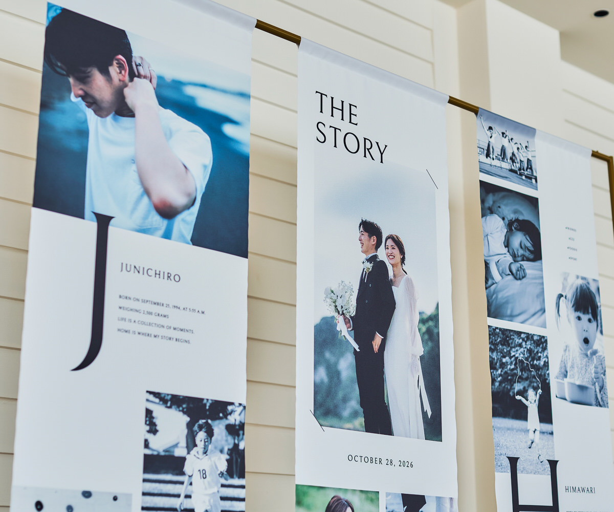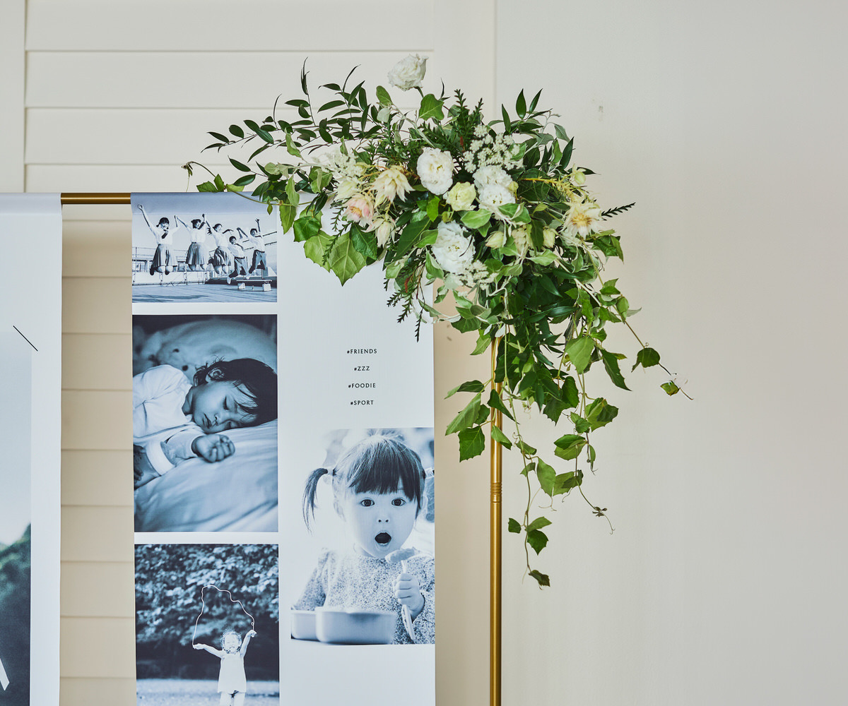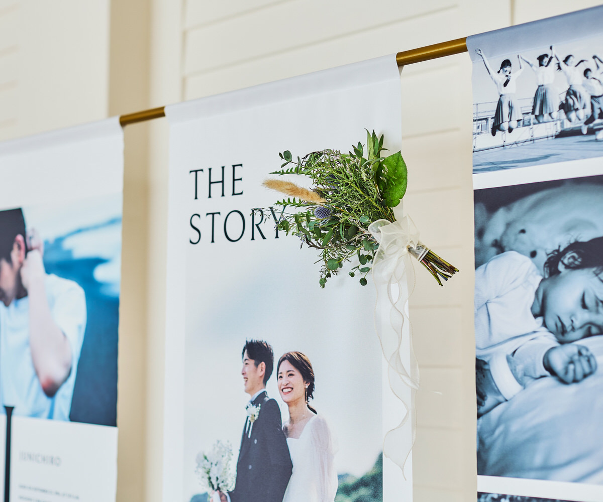 想い出をアートのように、たいせつな瞬間を並べたノバレーゼオリジナルのフォトタペストリー。両サイドの布にはおふたりそれぞれの幼少期からの物語を、中央にはおふたりが出会われてからのストーリーを描くことができます。タペストリーにお花をプラスして華やかに演出することや両サイドのおふたり幼少期はご親族へのプレゼントしてそれぞれご家庭で素敵に飾れることまで計算されたデザインになっています。