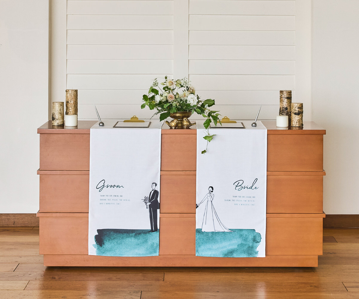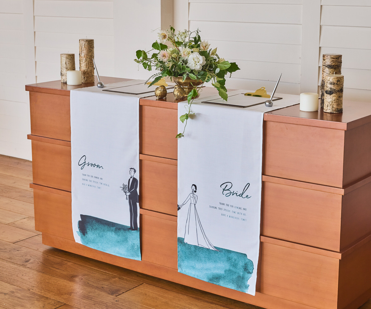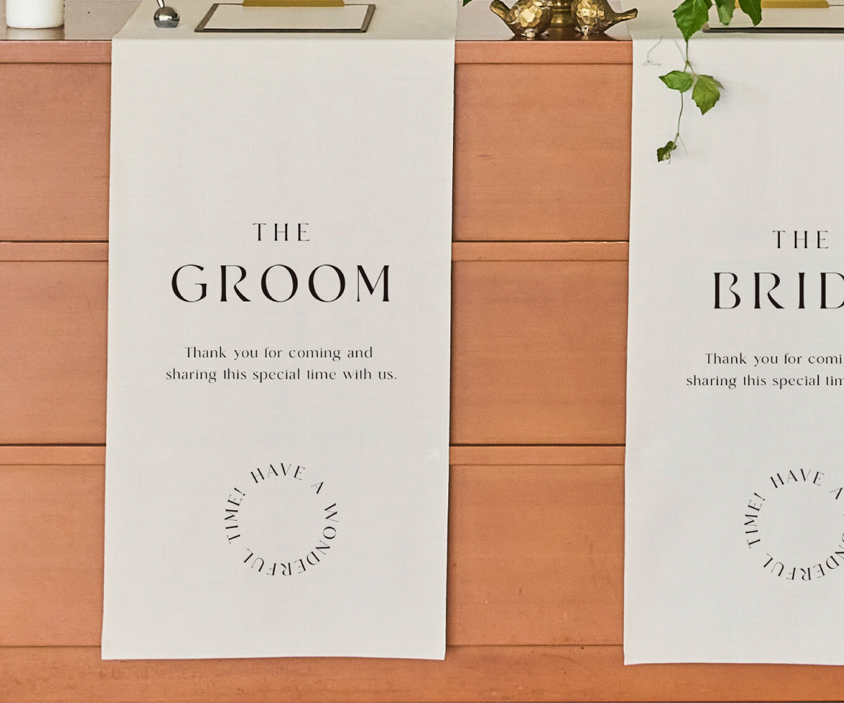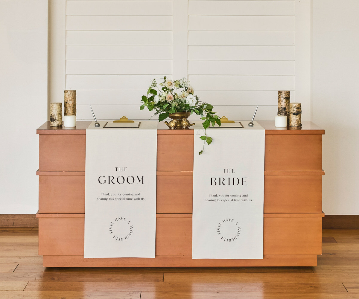 式場のエントランスに掲げる、特別な一枚。家紋と名前をあしらった暖簾は、ふたりの“はじまりの象徴”として、ゲストを迎え入れます。 古来より暖簾は、「家のしるし」であり「人を迎える心」。 その伝統を継ぎながら、現代的なミニマリズムなオリジナルデザインに仕上げました。 中央のタイポグラフィは“誓いの言葉”を静かに掲げ、左右に並ぶ家紋とおふたりのお名前で存在を美しく引き立て、5つの“誓いの色”は、それぞれに意味を持つ色の物語です。おふたりの個性や会場の雰囲気に合わせて 5つの“誓いの色”から、おふたりらしい一枚をお選びください。
