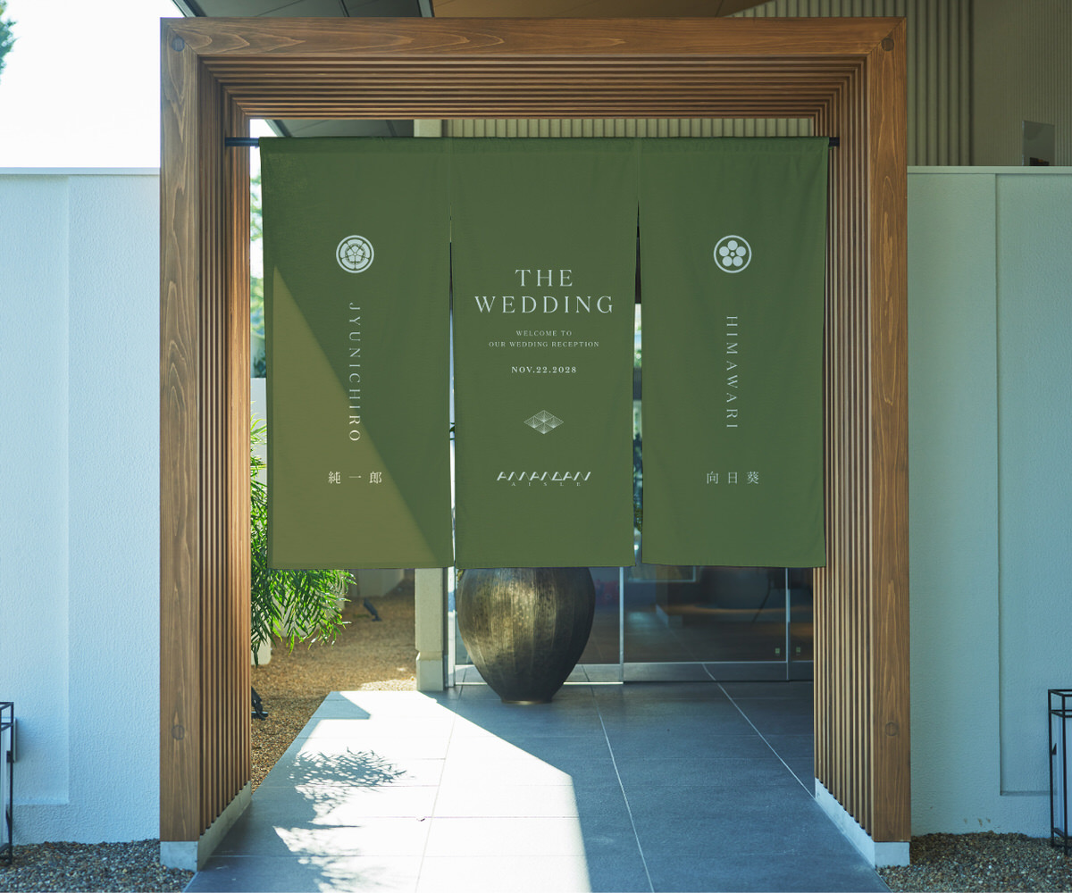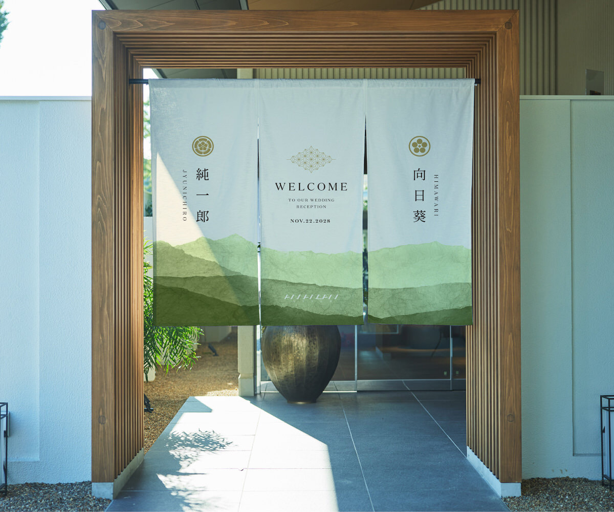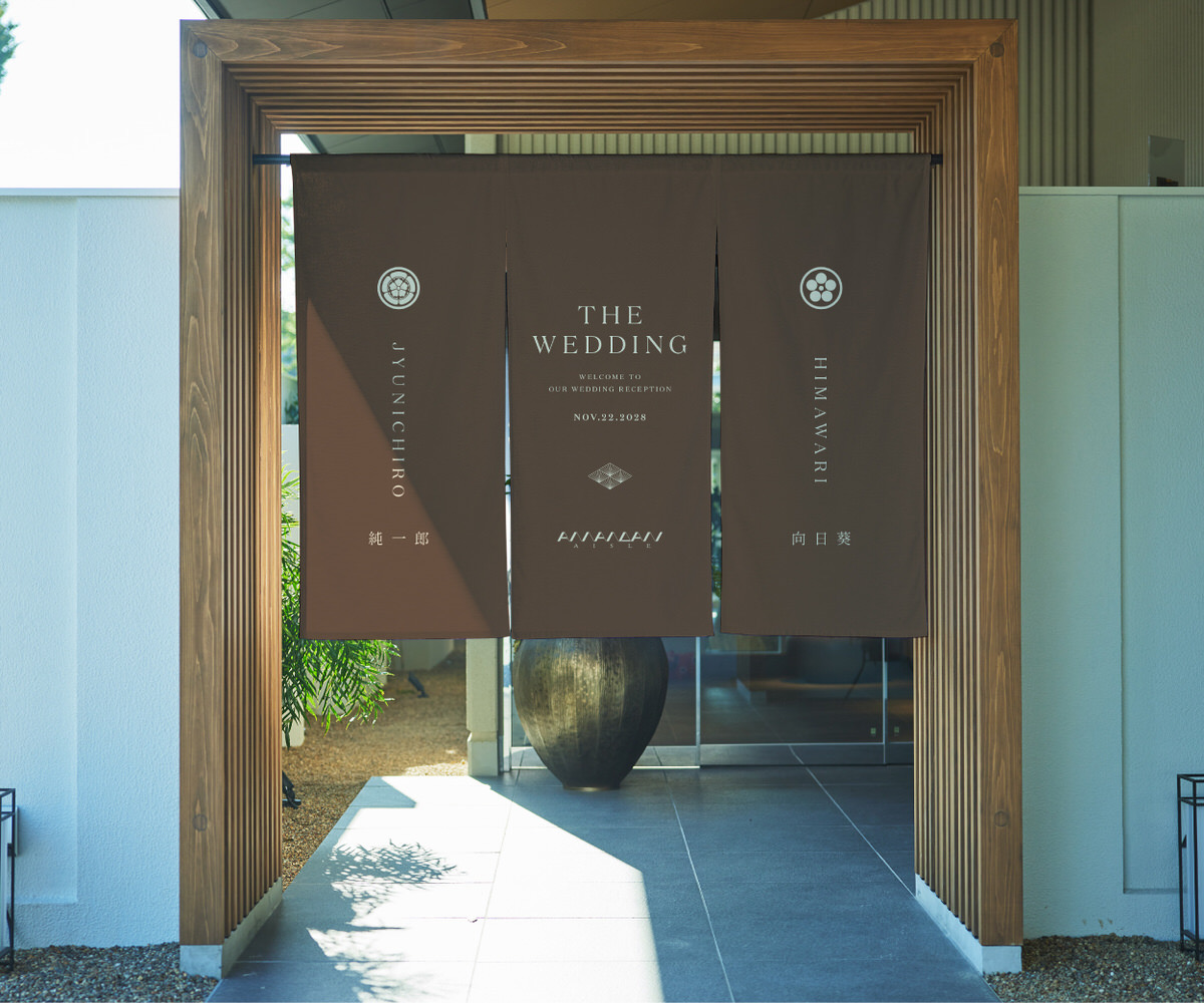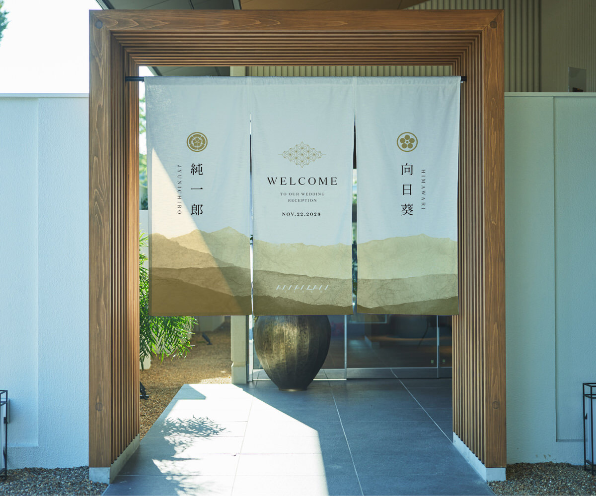式場のエントランスに掲げる、特別な一枚。家紋と名前をあしらった暖簾は、ふたりの“はじまりの象徴”として、ゲストを迎え入れます。