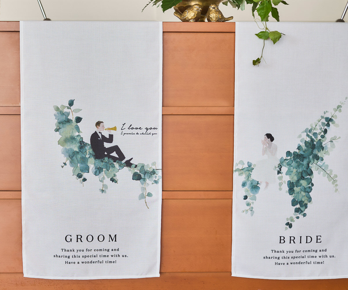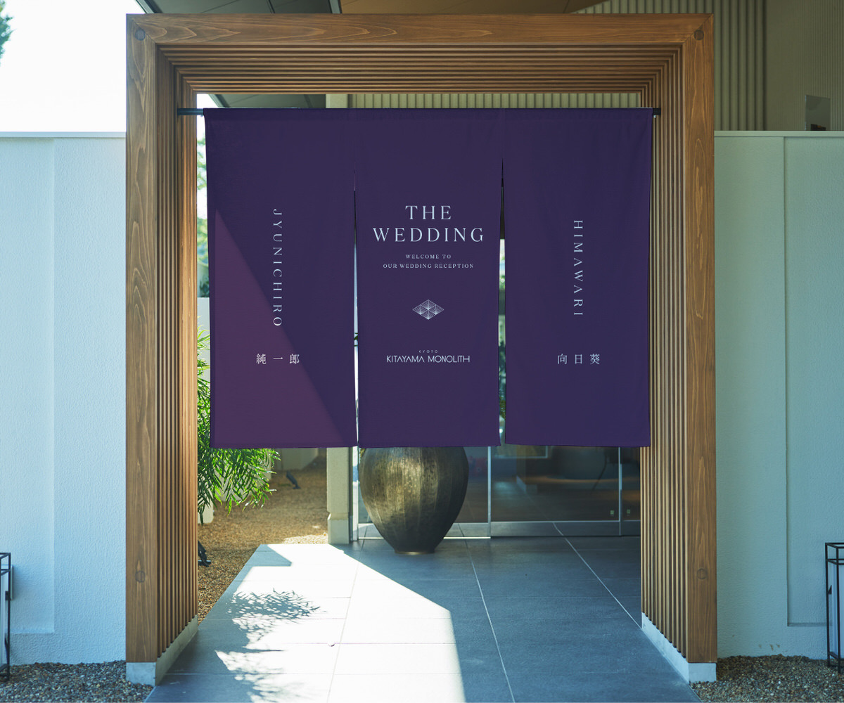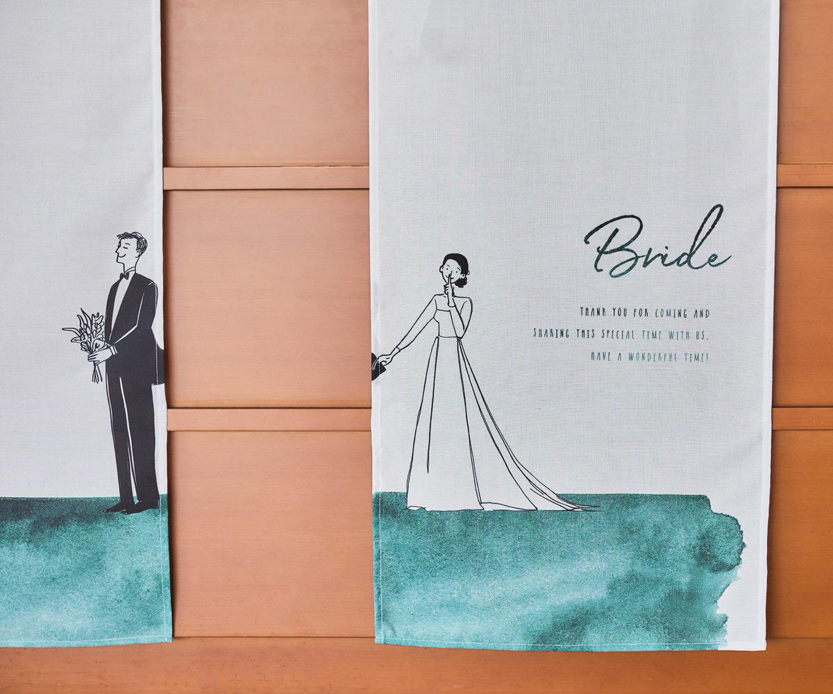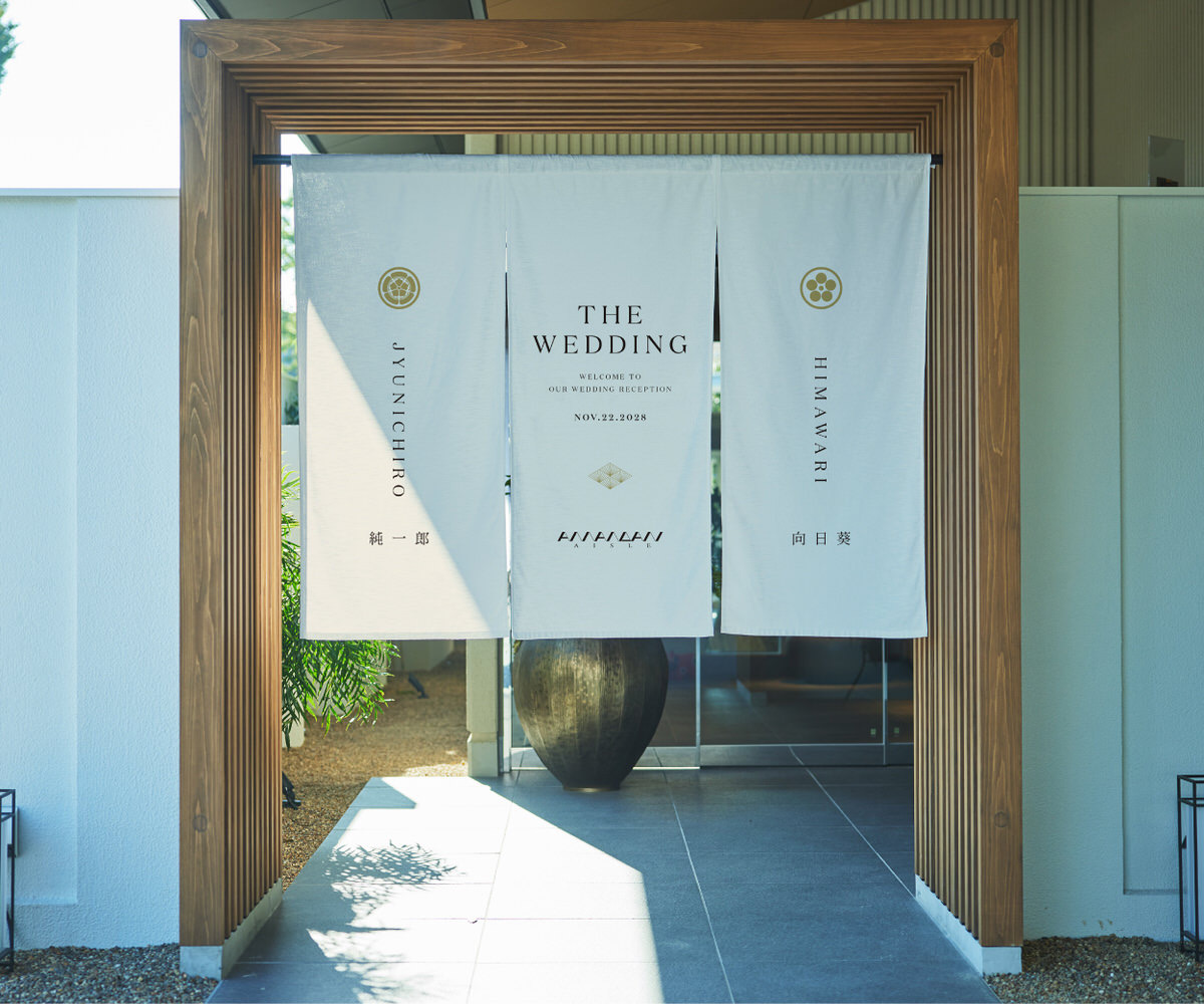 式場のエントランスに掲げる、特別な一枚。家紋と名前をあしらった暖簾は、ふたりの“はじまりの象徴”として、ゲストを迎え入れます。